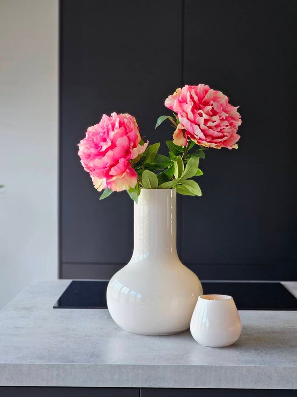 Chique, sereen en tijdloos dat vinden wij wel van de Seim Ivory S. Doe er een losse tak in, mooie pioenrozen of een groot boeket, je kunt werkelijk alle kanten op met deze sfeervolle vaas.