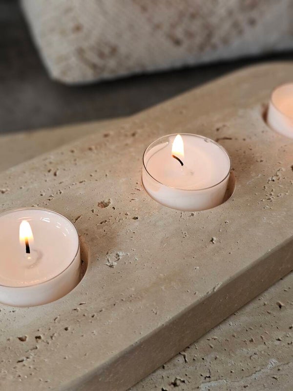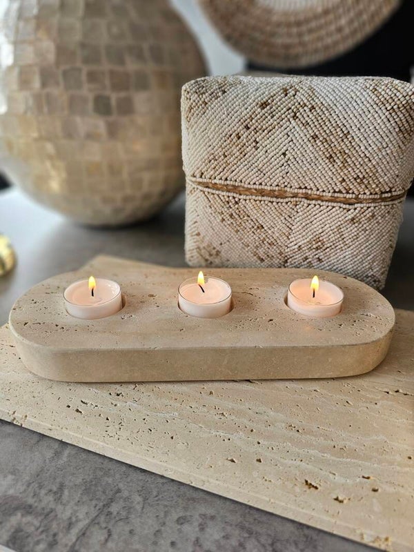 Breng serene sfeer in huis met dit prachtige Travertine waxinelicht plateau van Mooisa. Het plateau is geschikt voor 3 waxinelichten.