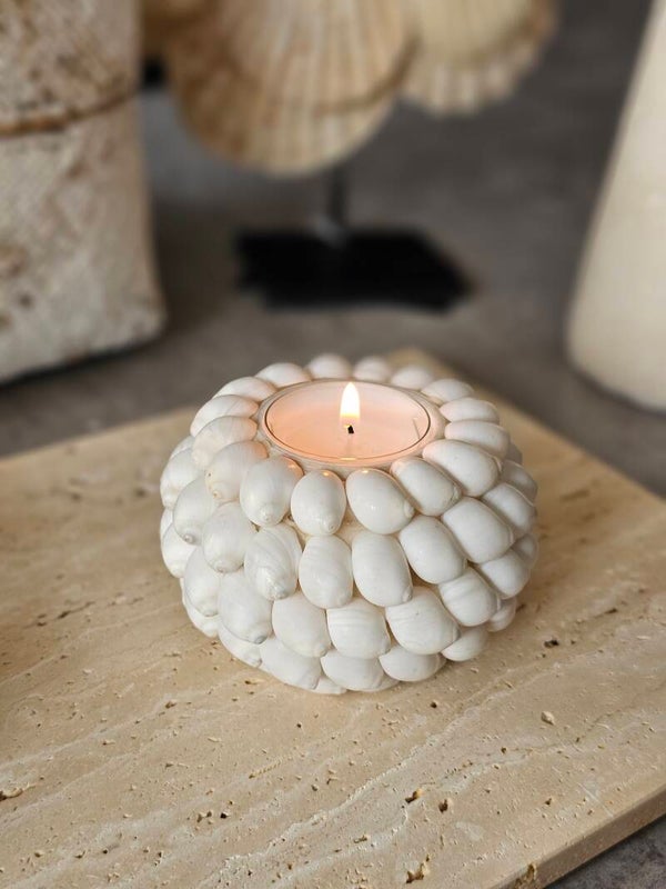 Breng serene rust in huis met dit mooie waxinelichthoudertje rondom vervaardigd met kleine witte schelpen.