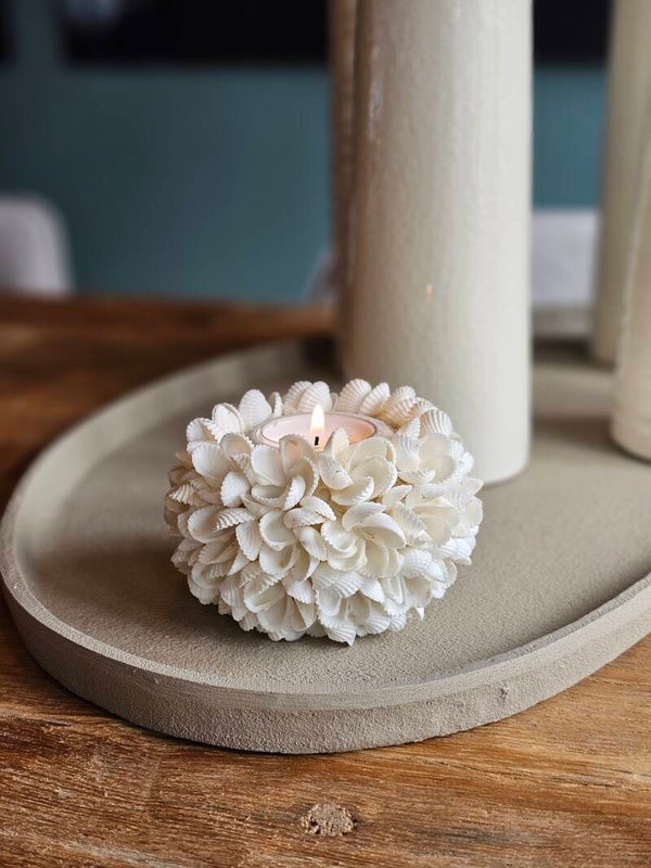 Breng serene rust in huis met dit mooie waxinelichthoudertje rondom vervaardigd met kleine witte schelpen