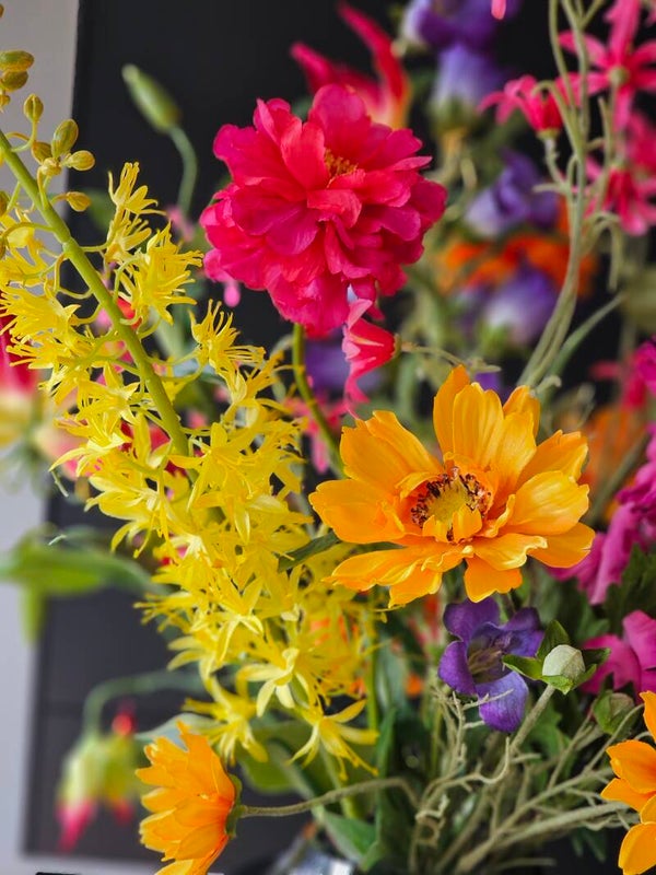 Met dit prachtige kleurrijke plukboeket haal je de zomer in huis. Het boeket bestaat onderanderen uit Gloriosa, Cosmos, Tagetes spray, Campanula en Eremurus.