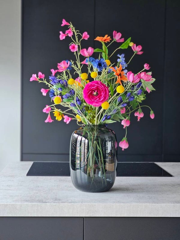 Het boeket staat op de foto opgemaakt in vaas Kara S ( 30cm)
