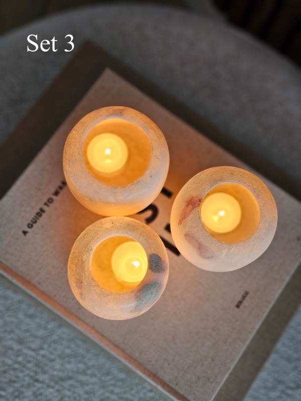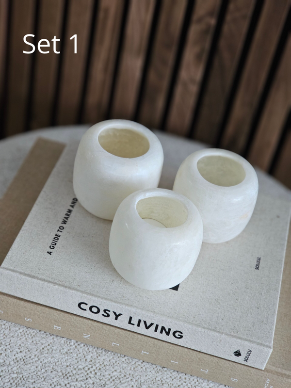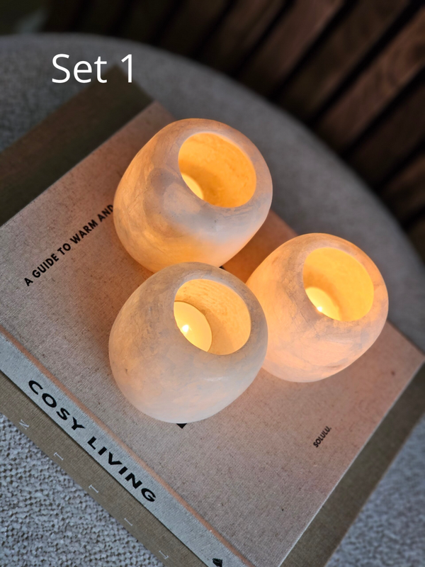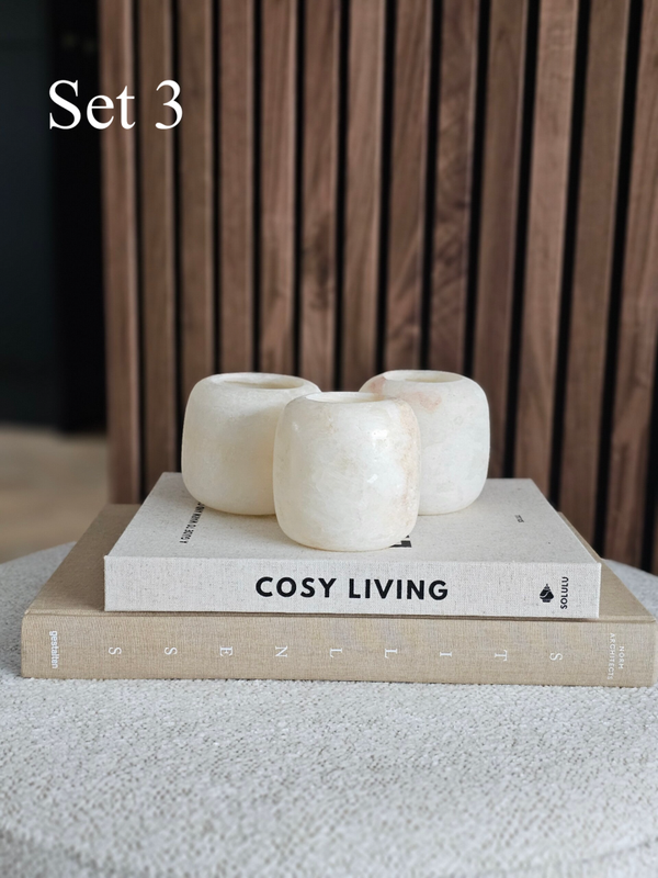Deze prachtige Alabaster set bestaat uit 3 Alabaster waxinelichthouders rond maat S +- 8cm hoog.