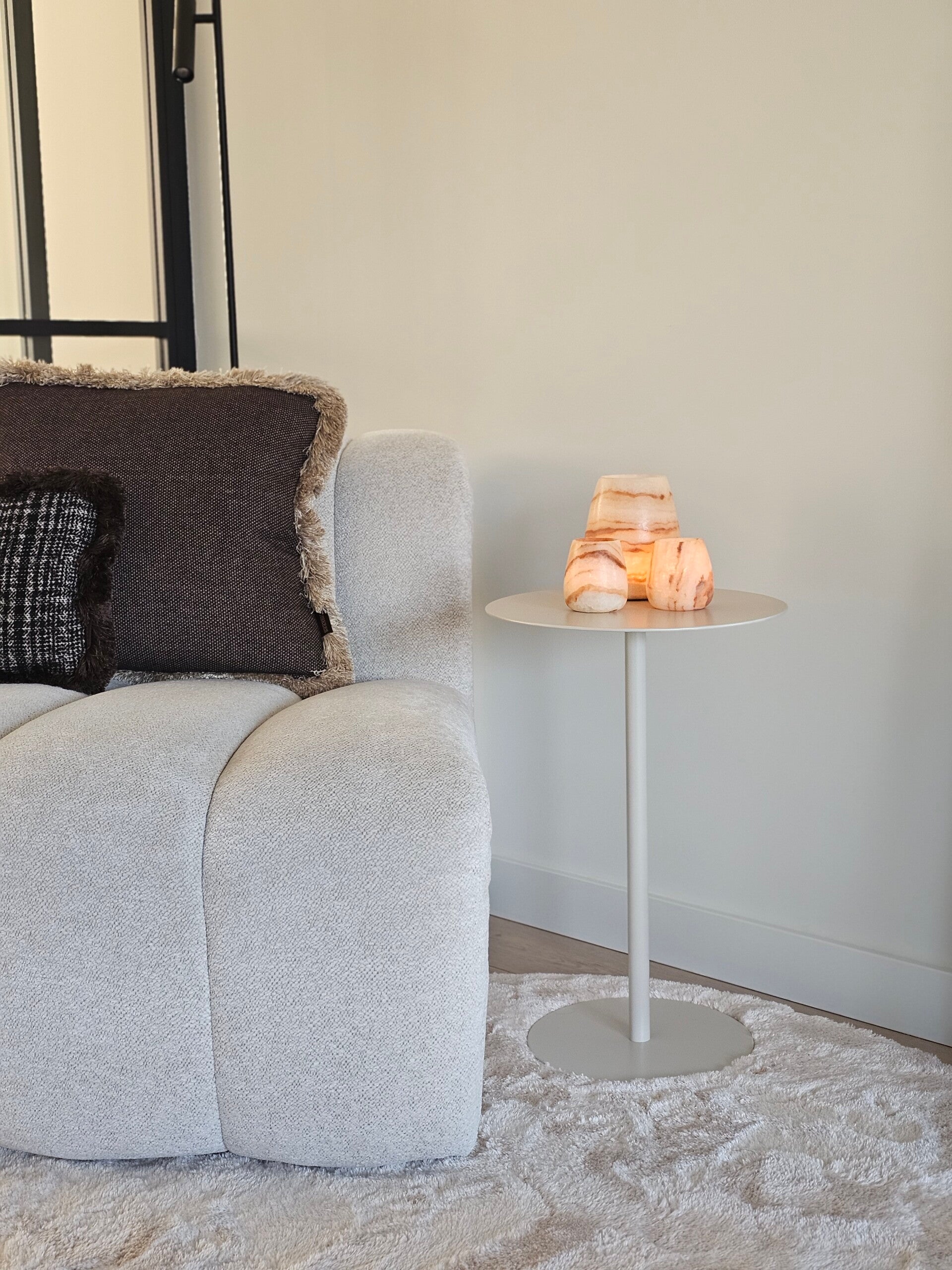 Alabaster is een bijzondere natuursteen die ontstaat wanneer water uit zoutmeren verdampt. Wat achterblijft is een korst die door de natuur langzaam wordt vervormd en verkleurd, tot een prachtig stuk steen. Eeuwenoude schoonheid, gevangen in een puur en duurzaam materiaal.