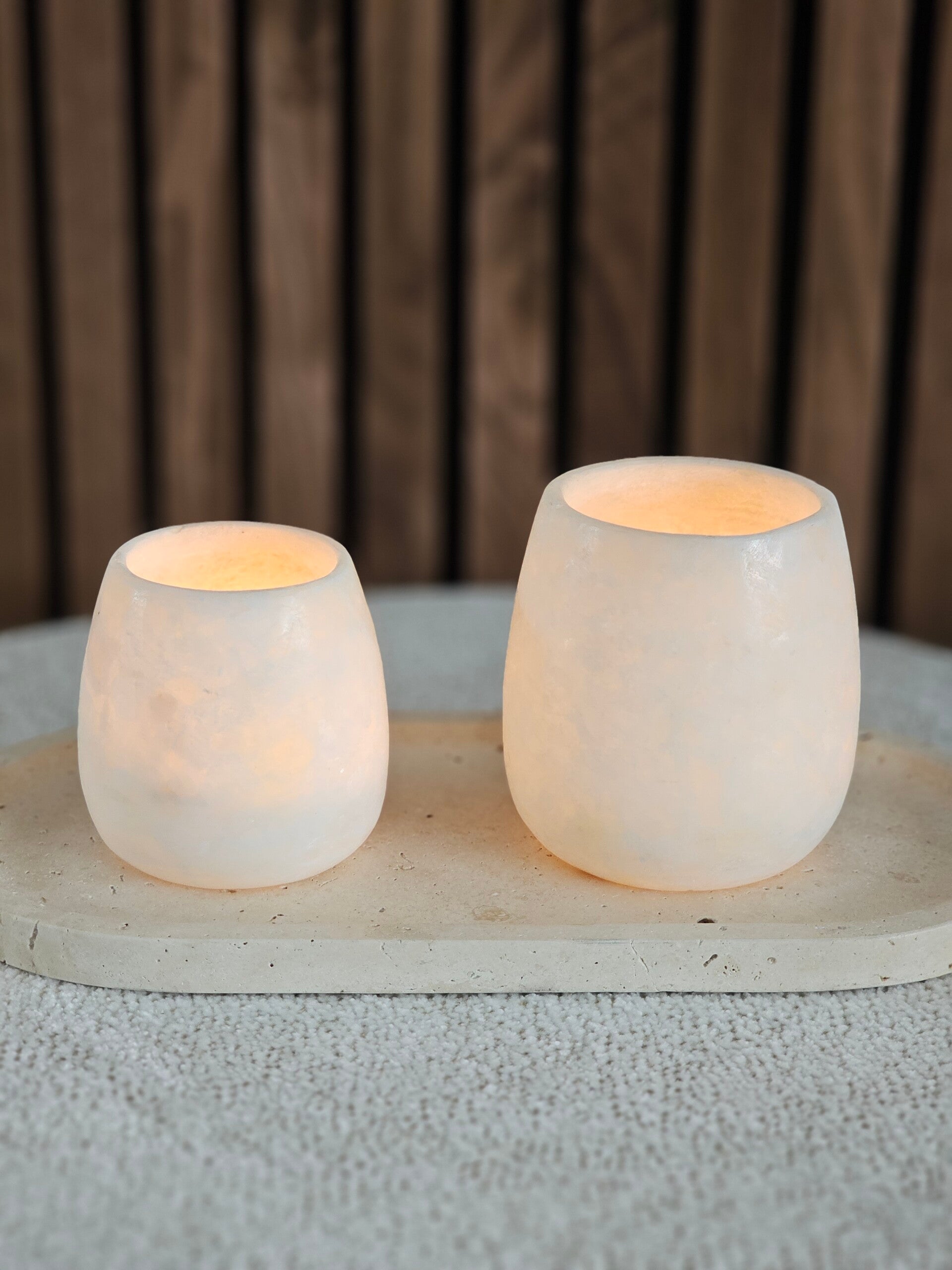 Dankzij de doorschijnende structuur laat alabaster het licht van een waxinelichtje zacht en warm door de steen heen schijnen. Het resultaat: een sfeervolle gloed die elke ruimte tot leven brengt, van woonkamer tot horecazaak.