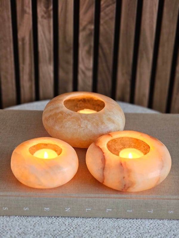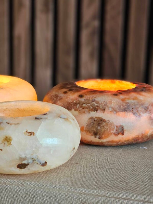 Dankzij de doorschijnende structuur laat alabaster het licht van een waxinelichtje zacht en warm door de steen heen schijnen. Het resultaat: een sfeervolle gloed die elke ruimte tot leven brengt, van woonkamer tot horecazaak.