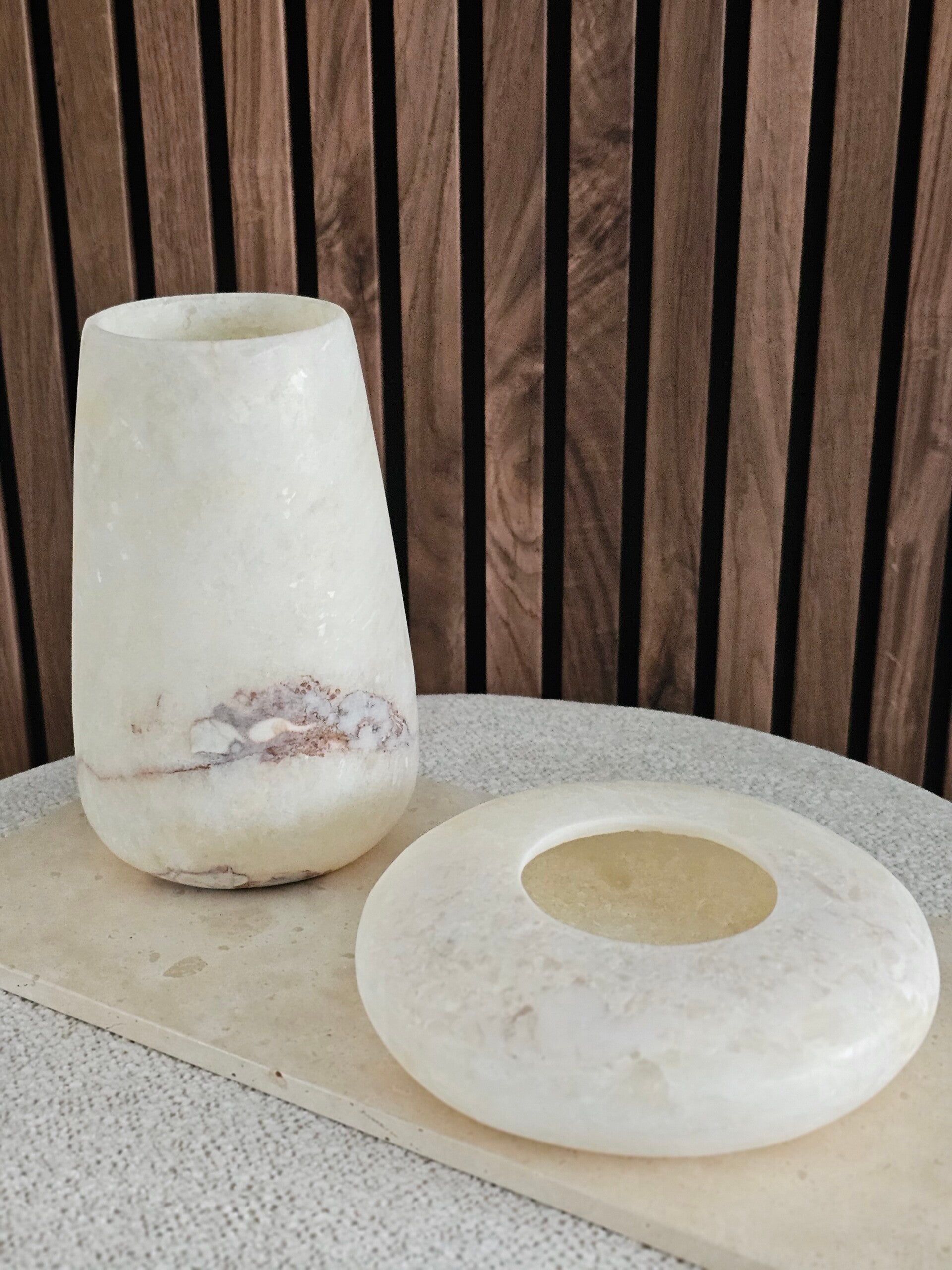 Alabaster is een bijzondere natuursteen die ontstaat wanneer water uit zoutmeren verdampt. Wat achterblijft is een korst die door de natuur langzaam wordt vervormd en verkleurd, tot een prachtig stuk steen. Eeuwenoude schoonheid, gevangen in een puur en duurzaam materiaal.