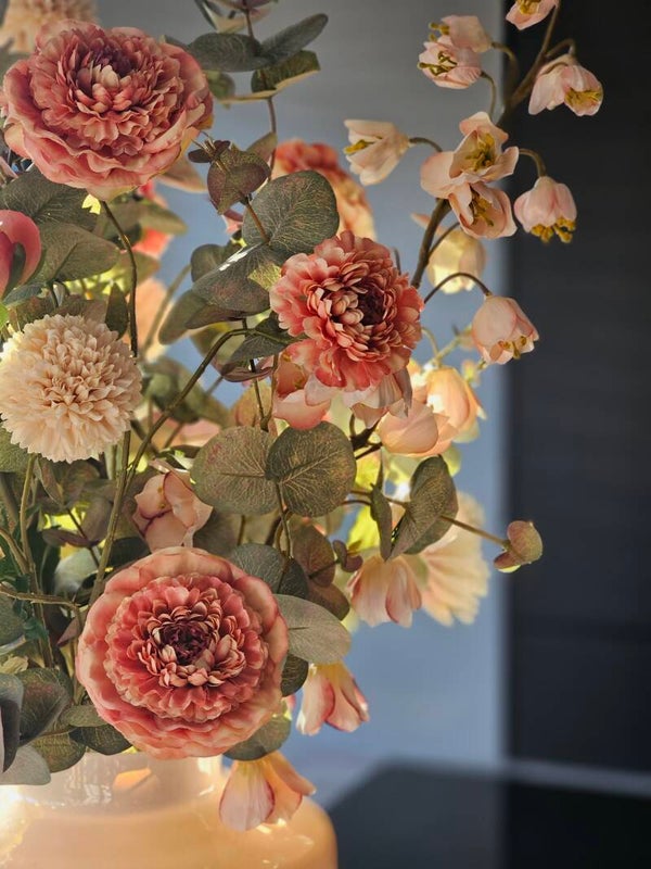 Dit prachtige rijk gevulde boeket bestaat uit zachte groen, roze en beige tinten. Het boeket is rondom opgemaakt en is echt een lust voor het oog. In het boeket zitten onderanderen Eucalyptus, Klaproos, PomPom en Ranonkel.
