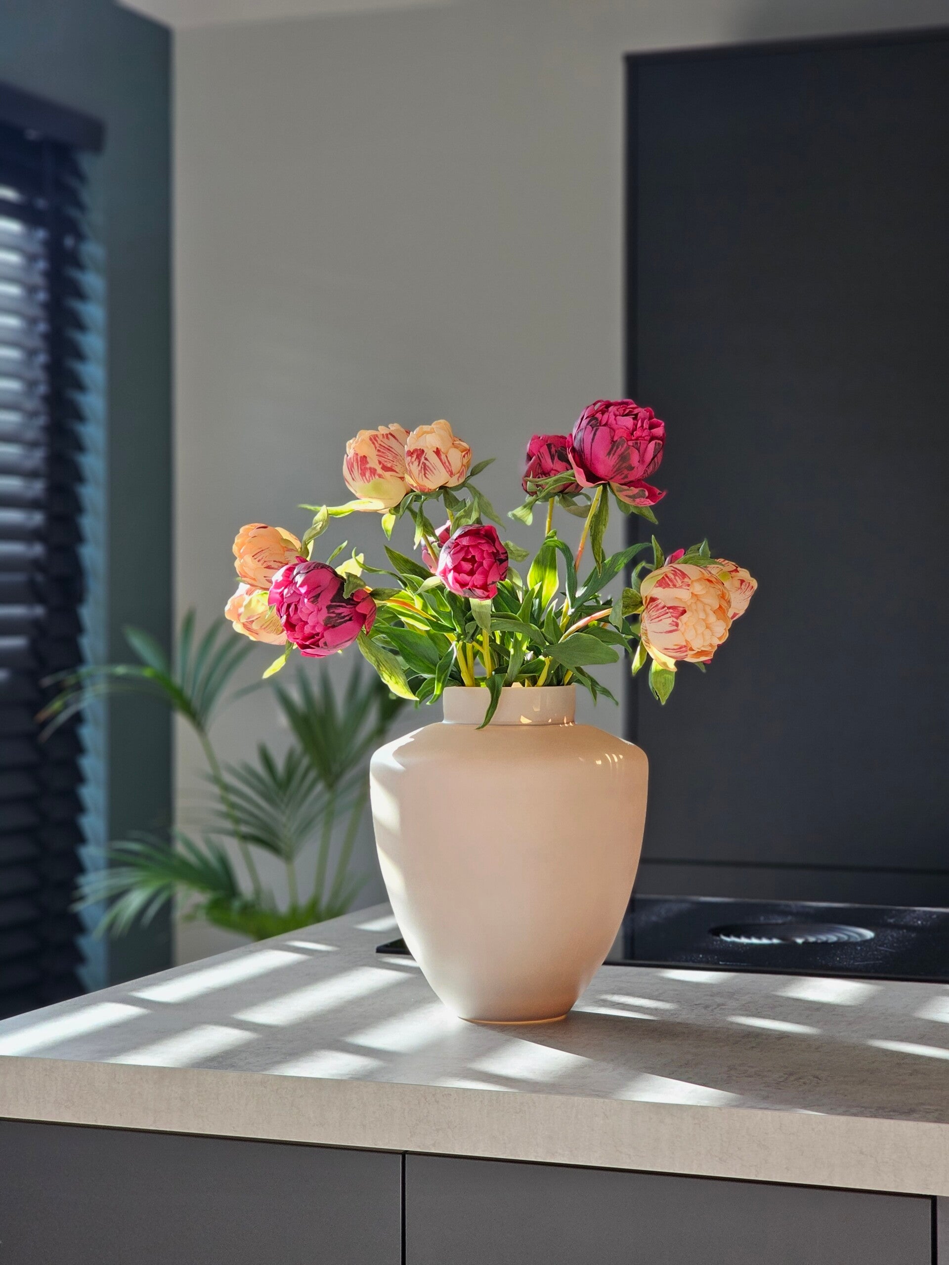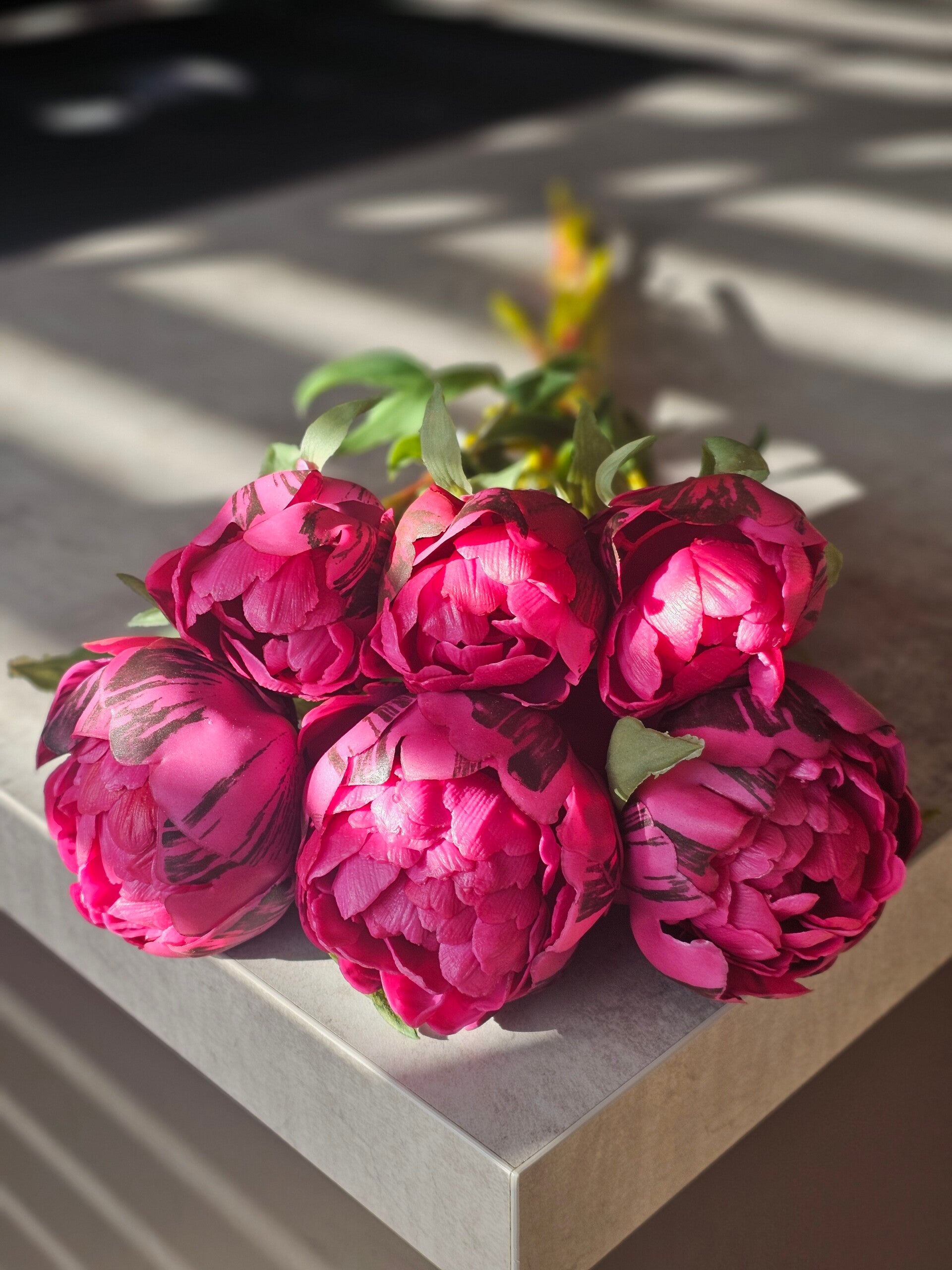 De Pioenrozen zijn in 2 maten ( 48cm en 63cm) en 4 kleuren verkrijgbaar. De pioenrozen worden per 3 stuks verkocht. Om een mooi speels effect te creeeren raden wij aan om 2 maten te combineren.